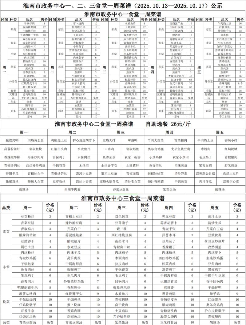 市政务中心一、二、三食堂一周菜谱(2025.10.13-2025.10.17)