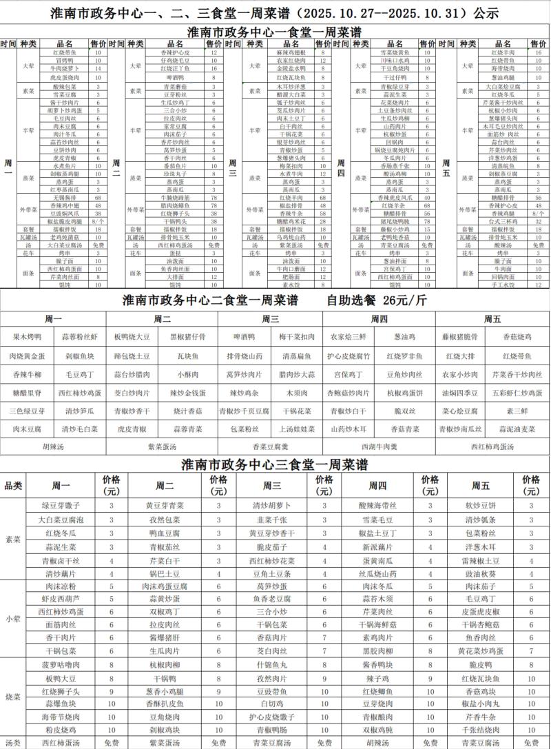 市政务中心一、二、三食堂一周菜谱(2025.10.27-2025.10.31)