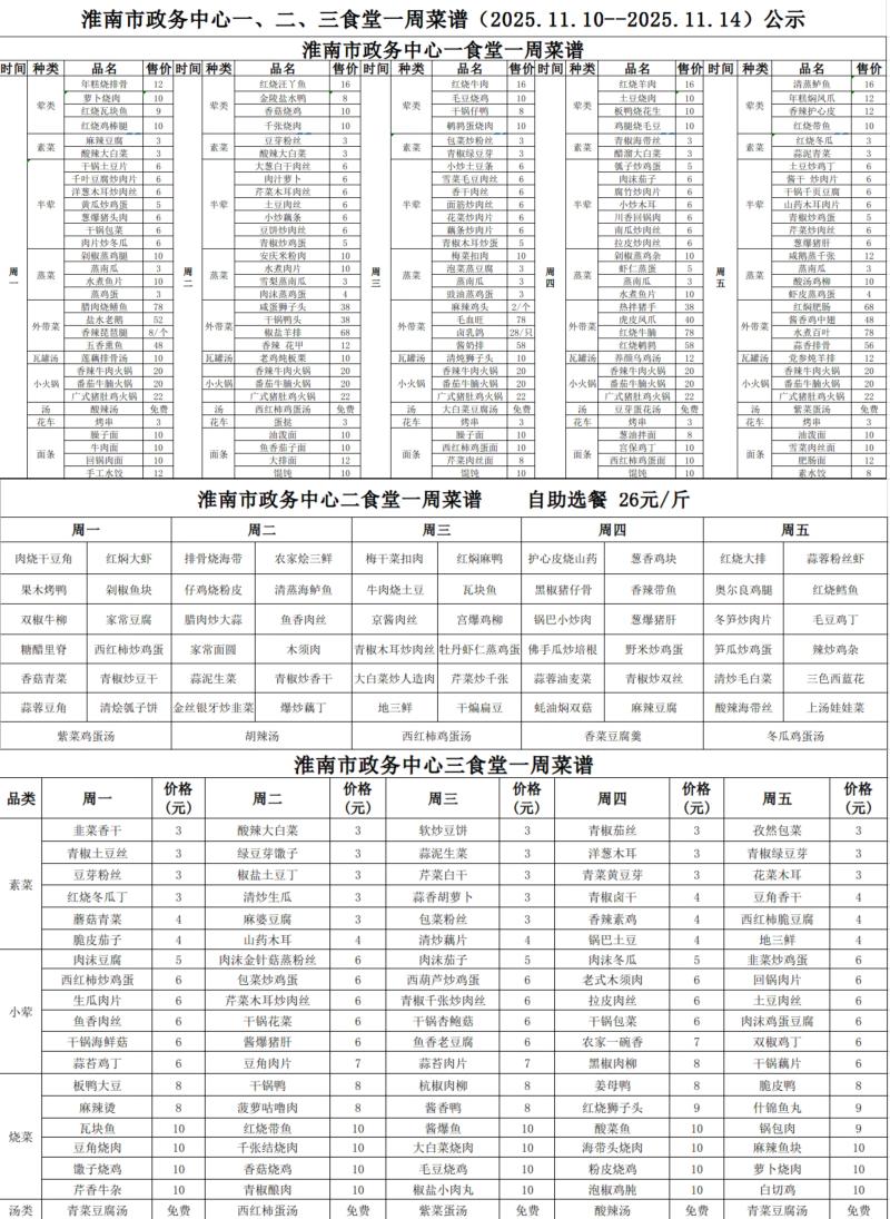 市政务中心一、二、三食堂一周菜谱(2025.11.10-2025.11.14)