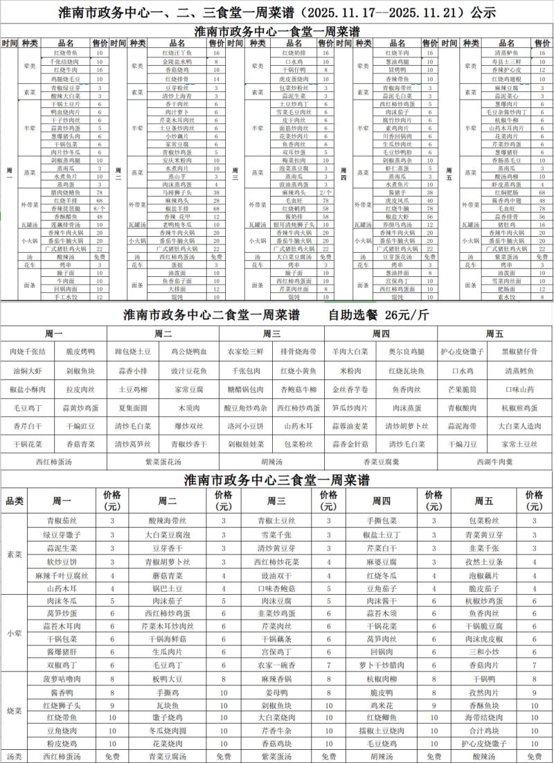 市政务中心一、二、三食堂一周菜谱(2025.11.17-2025.11.21)