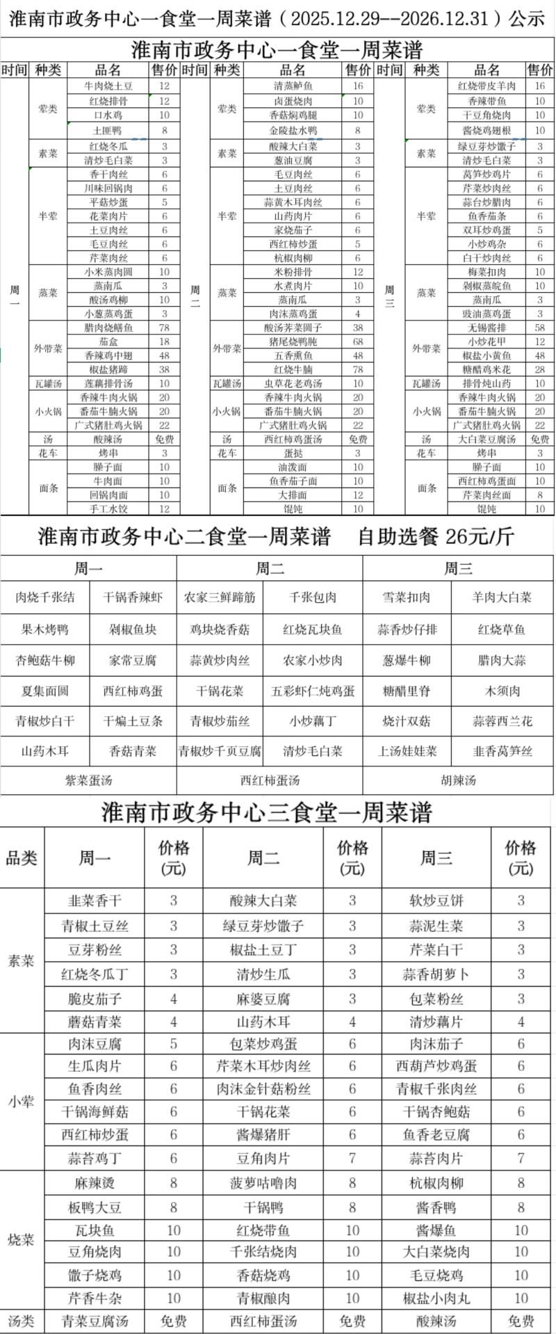 市政务中心一、二、三食堂一周菜谱(2025.12.29-2025.12.31)