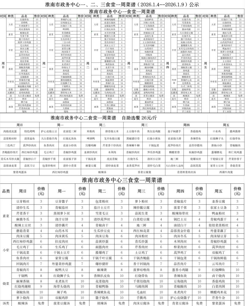市政务中心一、二、三食堂一周菜谱(2026.1.4-2026.1.9)