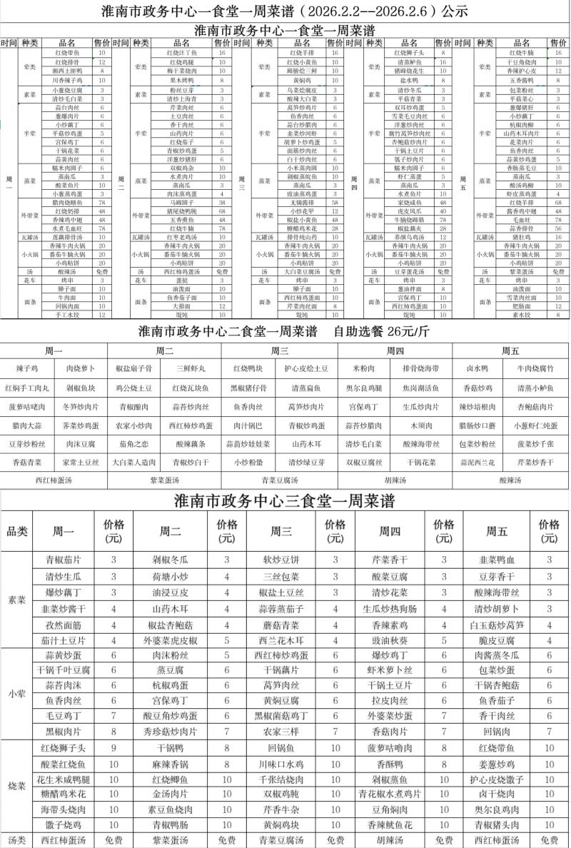 市政务中心一、二、三食堂一周菜谱(2026.2.2-2026.2.6)
